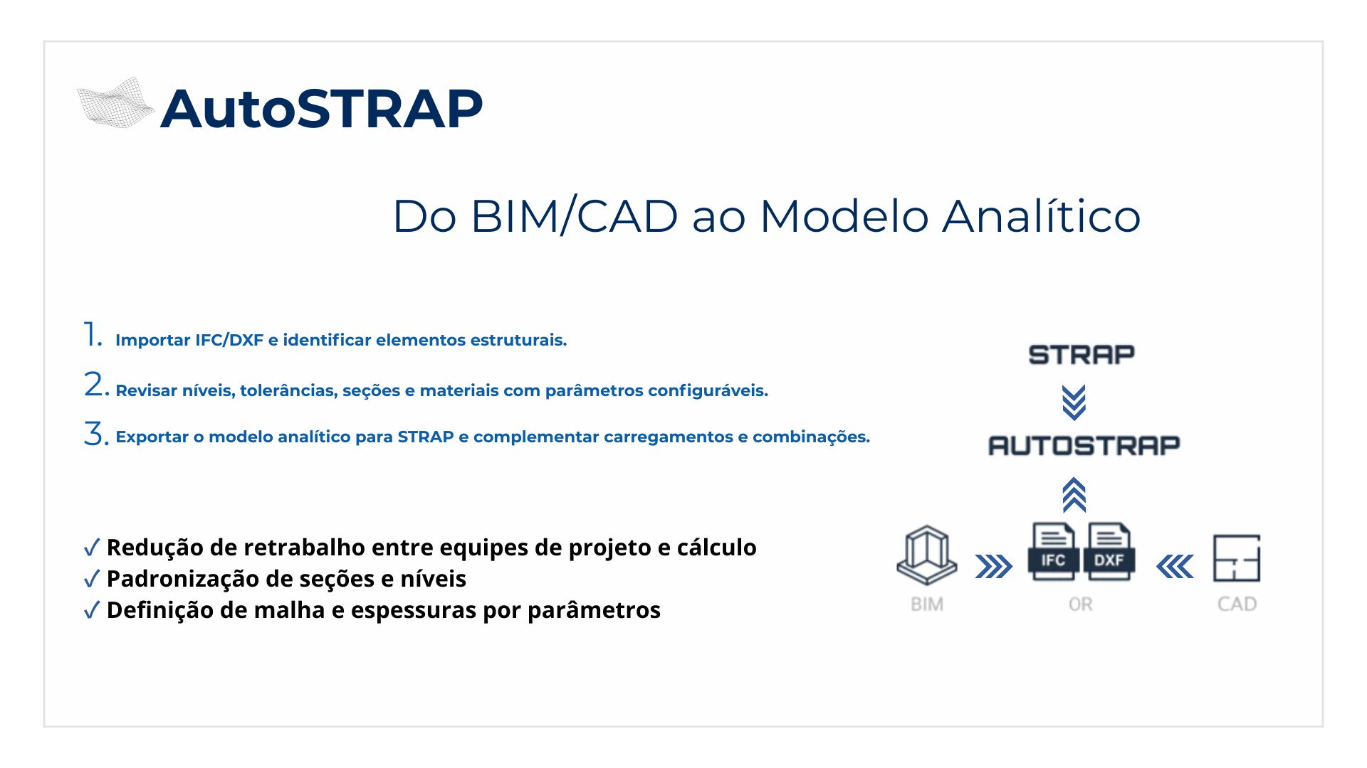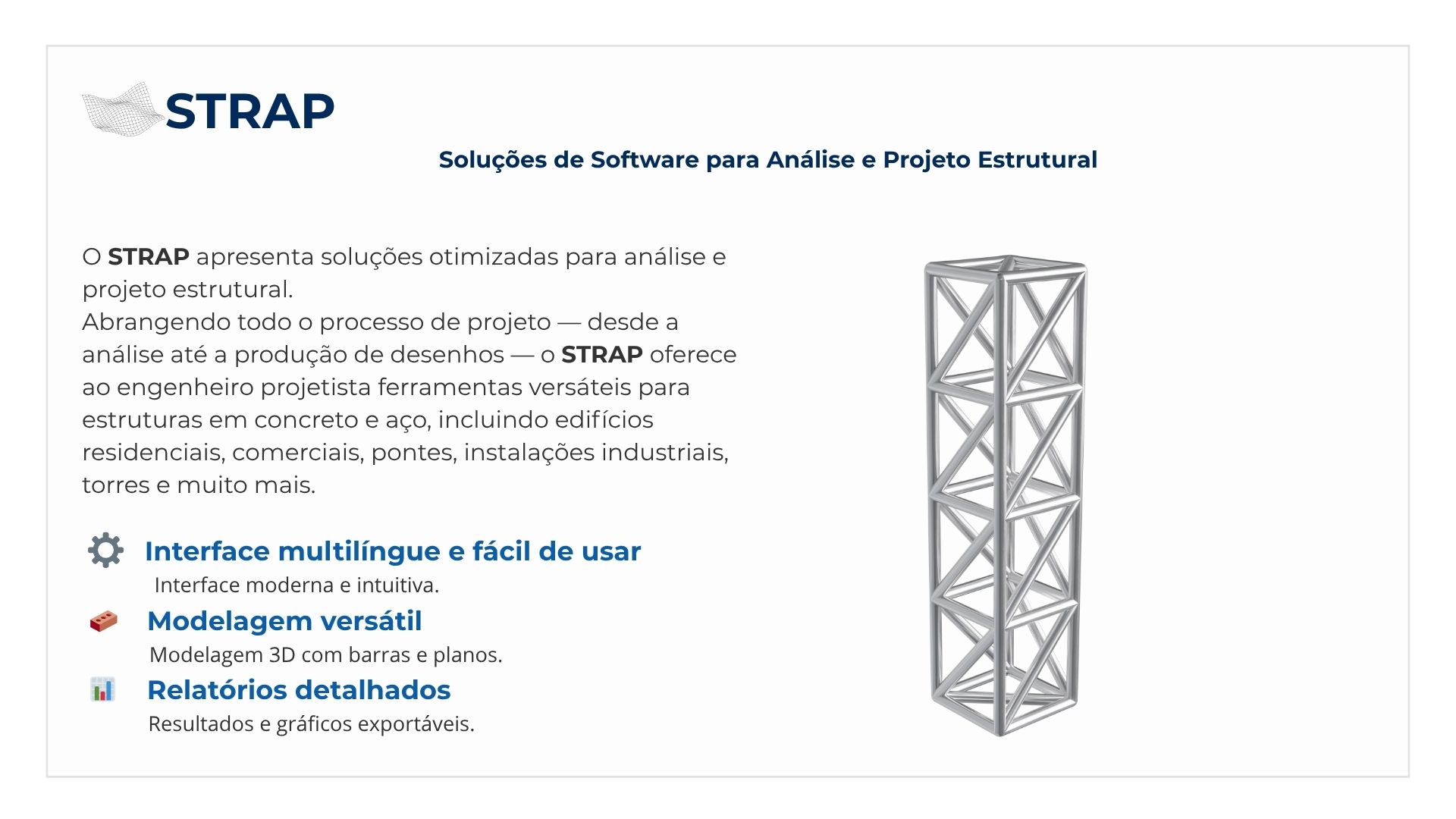 Atuamos com excelência na comercialização, suporte técnico e formação profissional para o software STRAP — ferramenta completa para análise e dimensionamento de estruturas em concreto e aço.